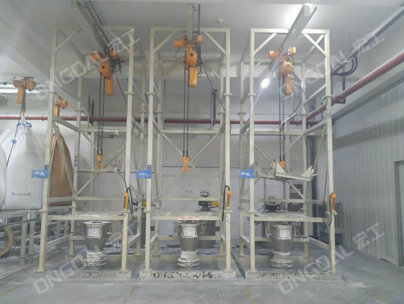 1、原料投料工段:系統通過噸袋解包站和小袋解包站,實現了高效、無間斷的物料投料。新增的小袋解包站可以在系統故障時應急投料,確保生產不中斷。